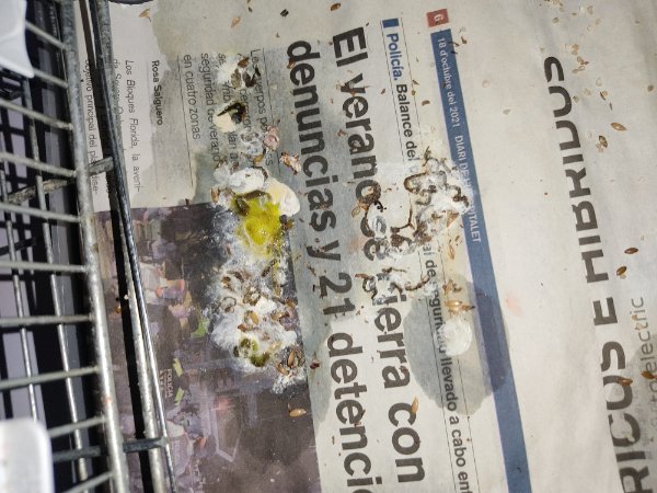 La diferencia entre ellos es que uno todavía está en muda y las heces tienen resto de pigmento.